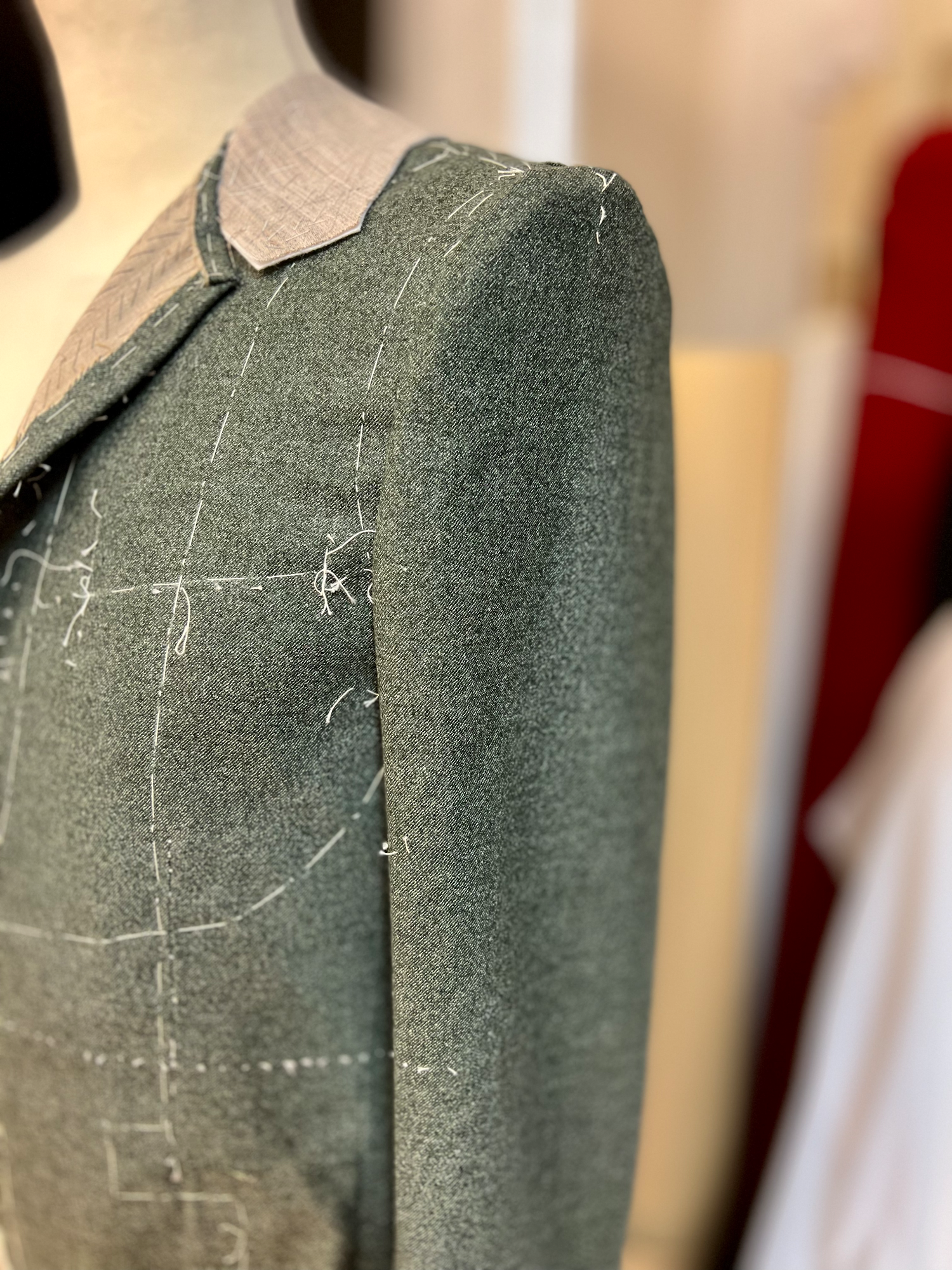 Beginn bei der Stoffauswahl für ein Maßsakko mit Verlauf über einzelne Schritte, sowie 1. & 2. Anprobe